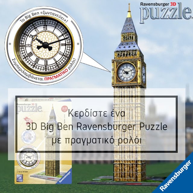 Εμείς λοιπόν έχουμε την χαρά, μαζί με την εταιρία John Hellas/Ravensburger να χαρίσουμε σε έναν τυχερό φίλο το Big Ben Puzzle με το πραγματικό ρολόι. Διαβάστε προσεκτικά τους όρους συμμετοχής και πού ξέρετε; Μπορεί εσείς να είστε ο τυχερός φίλος ή η τυχερή φίλη που θα κερδίσει!