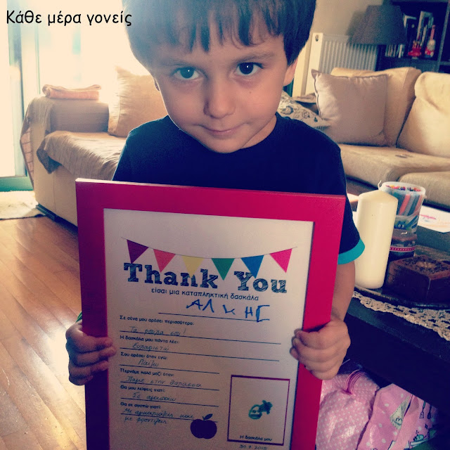 Πριν μερικά χρόνια είχαμε ετοιμάσει κάτι πολύ όμορφο και πολύ προσωπικό για τις δασκάλες του Άρη στο προνήπιο (πατήστε εδώ για να διαβάσετε την σχετική ανάρτηση). Φέτος κινηθήκαμε στο ίδιο πνεύμα. Ήθελα να βρούμε έναν τρόπο να πει ο Άλκης στις δασκάλες του πως αισθάνεται ο ίδιος για αυτές και τι θα θυμάται από τον χρόνο που περάσανε μαζί. Και τότε βρήκα αυτό. Με την κατάλληλη επεξεργασία, μετατρέψαμε το κείμενο στα ελληνικά και ο Άλκης ήταν πανέτοιμος να απαντήσει στις κρίσιμες ερωτήσεις.
