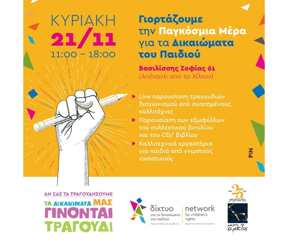 Το Δίκτυο για τα Δικαιώματα του Παιδιού και η Μικρή Άρκτος διοργανώνουν την Κυριακή 21 Νοεμβρίου 2021, (11:00-18:00) εορταστική εκδήλωση στην οδό Βασιλίσσης Σοφίας 61 (έναντι Χίλτον) με αφορμή την Παγκόσμια Ημέρα Δικαιωμάτων του Παιδιού.