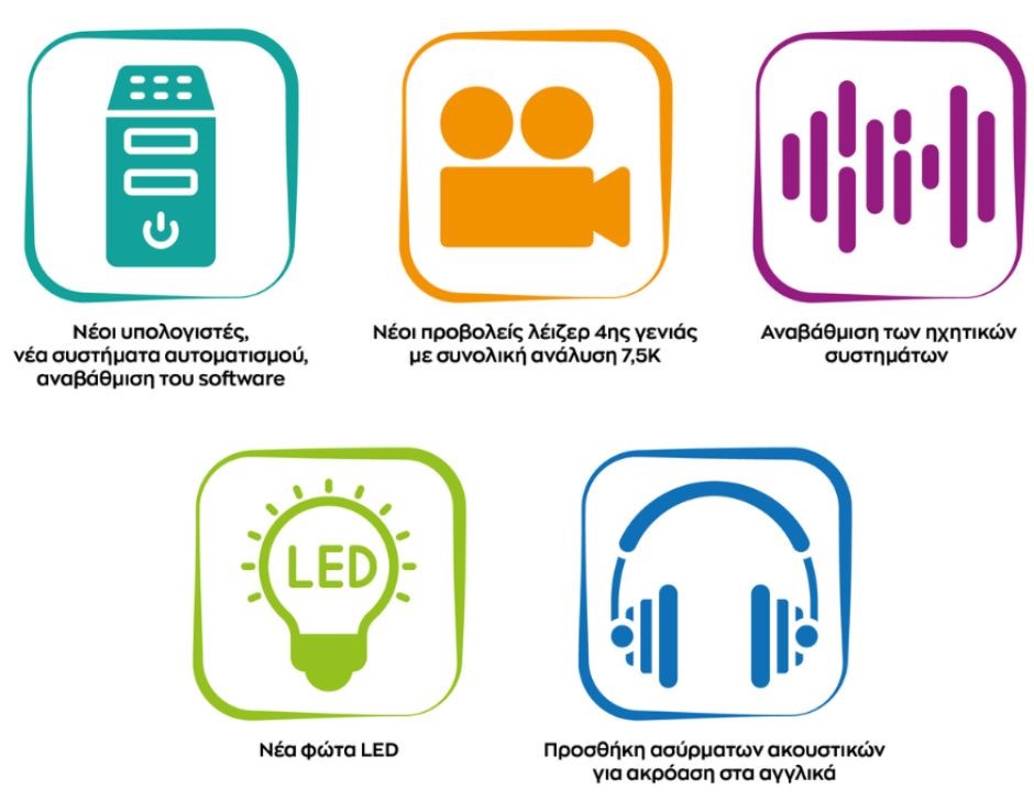 Οι οκτώ νέοι προβολείς λέιζερ 4ης γενιάς υψηλής ευκρίνειας, με συνολική ανάλυση 7,5Κ αναβαθμίζουν τον Θόλο του Νέου Ψηφιακού Πλανηταρίου σε έναν από τους πιο φωτεινούς του κόσμου. Ταυτόχρονα, πραγματοποιήθηκαν εκτεταμένες εργασίες για την αναβάθμιση των ηχητικών συστημάτων με εξοπλισμό τελευταίας γενιάς, προστέθηκαν νέοι υπολογιστές, νέα συστήματα αυτοματισμού, νέα φώτα LED, αναβαθμίστηκε το software και προστέθηκαν ασύρματα ακουστικά για ακρόαση στα αγγλικά, για τους ξένους επισκέπτες.