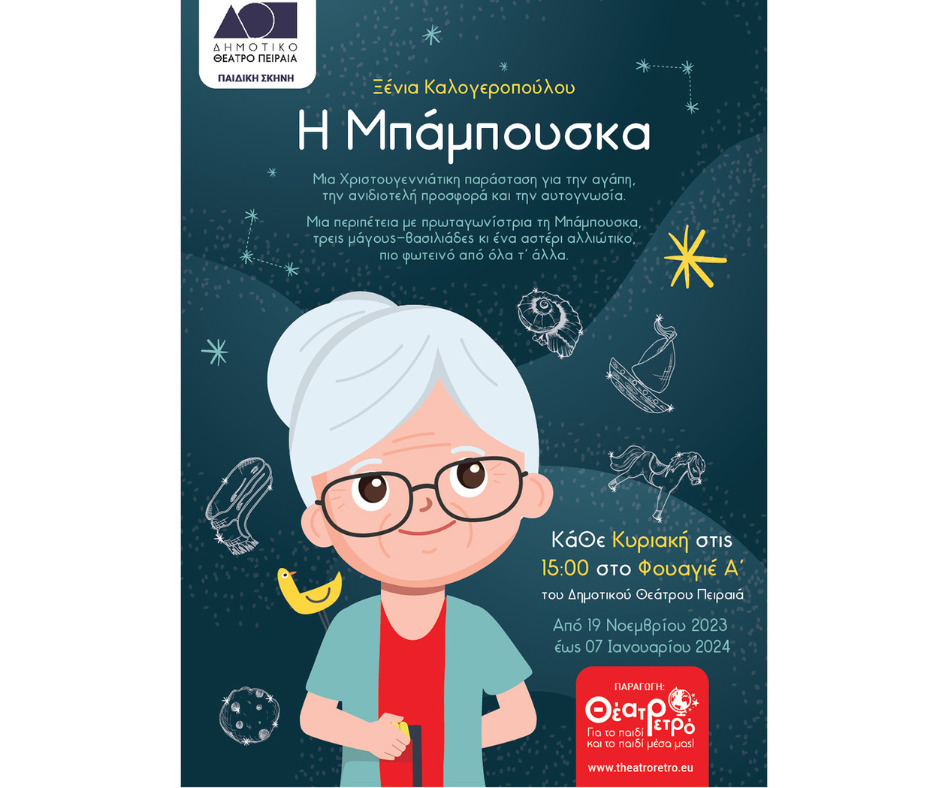 Το Δημοτικό Θέατρο Πειραιά ανοίγει την Παιδική Σκηνή του με την παράσταση Η Μπάμπουσκα, βασισμένη στην ομώνυμη χριστουγεννιάτικη ιστορία της πολυαγαπημένης συγγραφέα για παιδιά Ξένιας Καλογεροπούλου. Η ηθοποιός Αγγελική Φράγκου ζωντανεύει επί σκηνής τη Μπάμπουσκα, μια ηρωίδα που μιλά για την αγάπη, την ανιδιοτελή προσφορά και την αυτογνωσία.