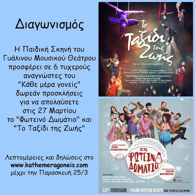 Σε συνεργασία με το θέατρο χαρίζουμε σε 3 τυχερούς από μια διπλή πρόσκληση για τις 27 Μαρτίου, στις 15:00, για την παράσταση “Στο Φωτεινό Δωμάτιο” και σε 3 ακόμη τυχερούς από μια διπλή πρόσκληση για την παράσταση “Το Ταξίδι της Ζωής” στις 27 Μαρτίου στις 18:30 (να τονίσω ότι είναι και η τελευταία παράσταση για φέτος!).