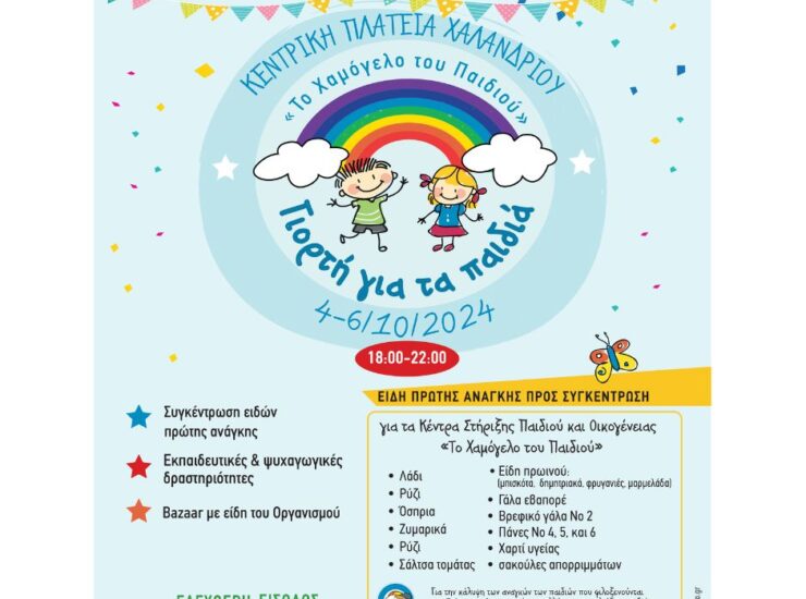 Γιορτή για τα Παιδιά στην Κεντρική Πλατεία Χαλανδρίου από «Το Χαμόγελο του Παιδιού». 4 Οκτωβρίου 2024 έως 6 Οκτωβρίου 2024 | 18:00-22:00 Μ την υποστήριξη του...