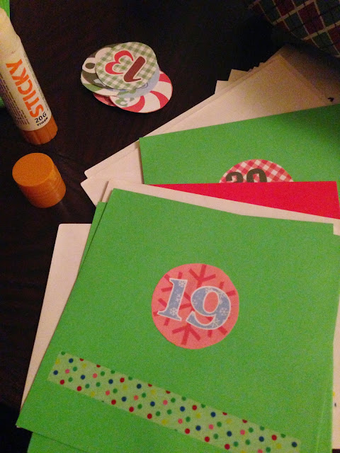 Σκέφτηκα λοιπόν τι θα μπορούσαμε να κάνουμε κάθε μέρα, έγραψα τα καρτελάκια και κόλλησα τα αυτοκόλλητα. Στην συνέχεια για να δώσω λίγο ακόμη χρώμα και χριστουγεννιάτικη διάθεση έβαλα σε κάθε φάκελο μια λωρίδα washi tape.