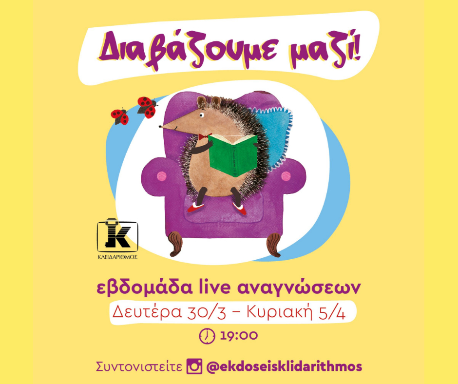 Γι’ αυτό οι Εκδόσεις Κλειδάριθμος μας καλούν να διαβάσουμε μαζί, μέσα από τον λογαριασμό τους στο Instagram. Καθημερινά, από την Δευτέρα 30 Μαρτίου μέχρι και την Κυριακή 4 Απριλίου, στις 19:00, συντονιζόμαστε στον Κλειδάριθμο, για να ακούσουμε ανθρώπους που αγαπούν το παιδικό βιβλίο, να μας αφηγούνται ιστορίες για μικρά αλλά και μεγαλύτερα παιδιά.