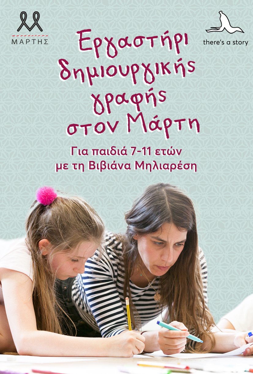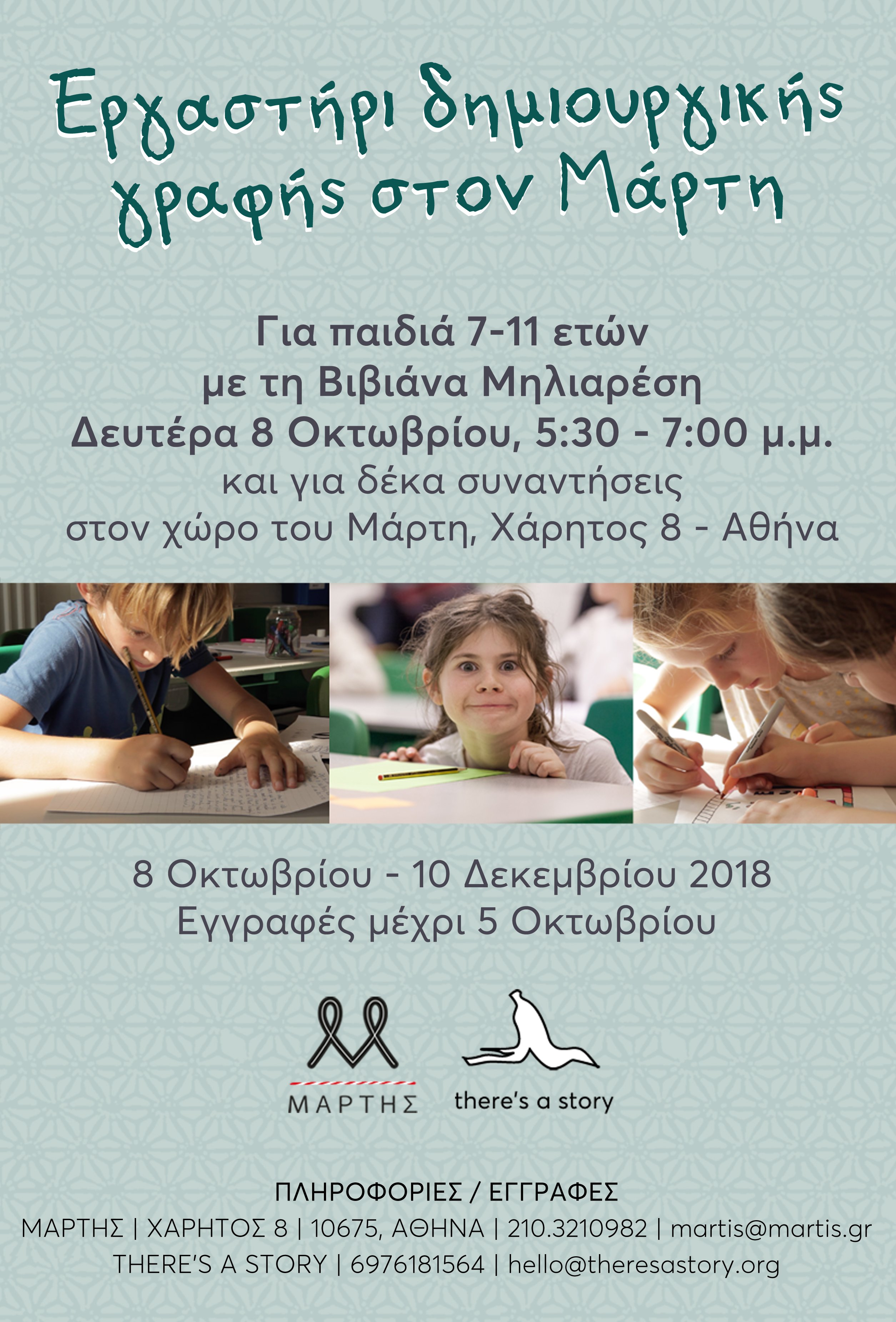 Τη Δευτέρα 8 Οκτωβρίου θα ξεκινήσει το εργαστήριο δημιουργικής γραφής με τη Βιβιάνα Μηλιαρέση, για παιδιά 7-11 ετών, στον χώρο των Εκδόσεων Μάρτης (Χάρητος 8, Κολωνάκι).