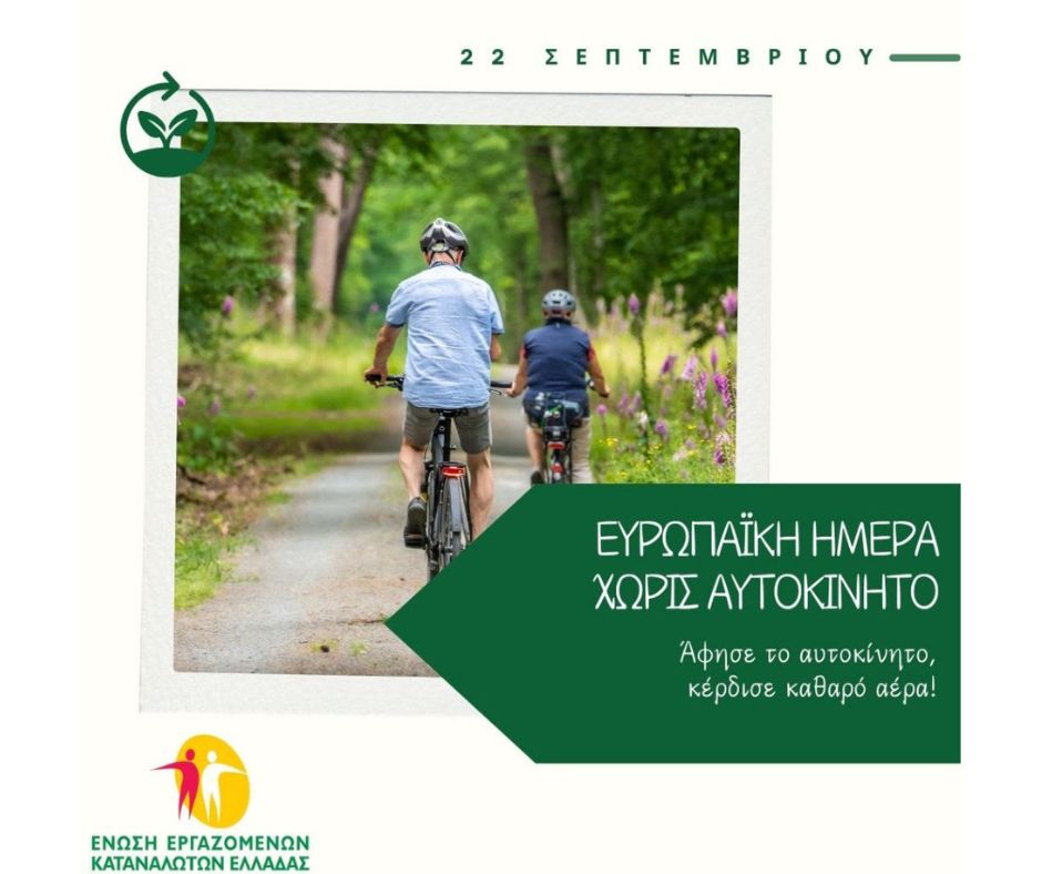 Η Ένωση Καταναλωτών Ελλάδας γιορτάζει την Ευρωπαϊκή Ημέρα χωρίς Αυτοκίνητο στις 22 Σεπτεμβρίου και παροτρύνει τους καταναλωτές να αφήσουν τα αυτοκίνητά τους και να επιλέξουν τα μέσα μαζικής μεταφοράς (ΜΜΜ) για τις μετακινήσεις τους.