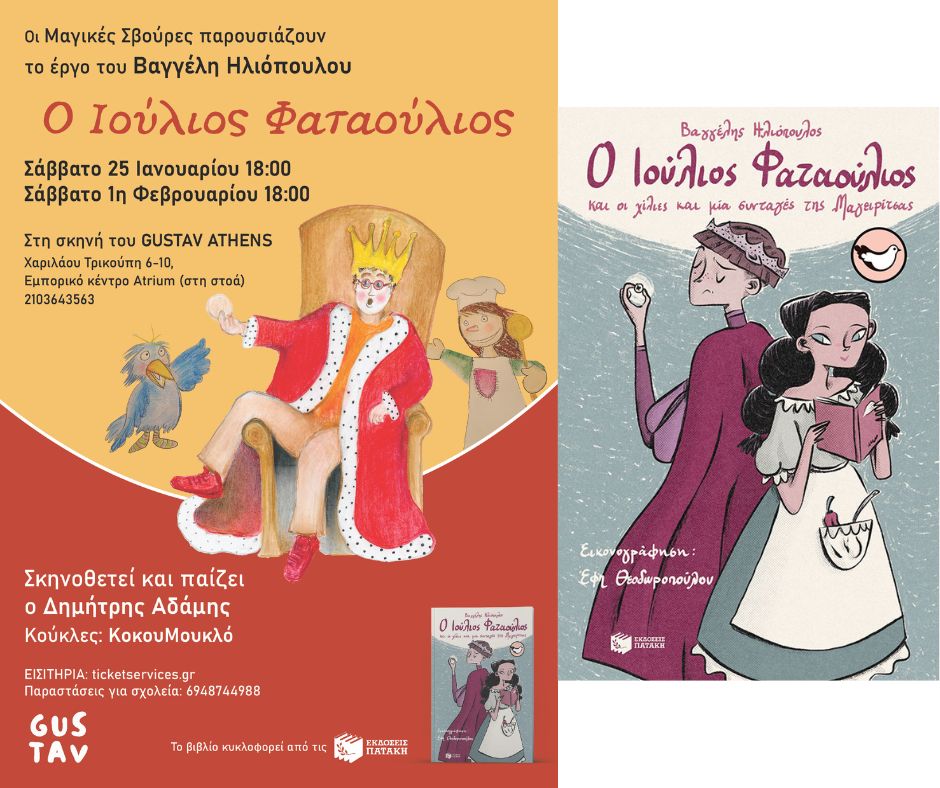Δυο αγαπημένοι των παιδιών, ο Δημήτρης Αδάμης, συγγραφέας και σκηνοθέτης επιτυχημένων παραστάσεων όπως “Ο Νιλς Χόλγκερσον“, “Δον Κιχώτης“, “Η Αλίκη στη Χώρα των Θαυμάτων“, και ο Βαγγέλης Ηλιόπουλος, συγγραφέας του “Τριγωνοψαρούλη” και τόσων άλλων αγαπημένων βιβλίων, συνεργάζονται για πρώτη φορά στο έργο “Ο Ιούλιος Φαταούλιος“, το οποίο ανεβαίνει στη Σκηνή του Πολυχώρου Πολιτισμού GUSTAV ATHENS, Χαριλάου Τρικούπη 6 – 10 στο Εμπορικό κέντρο Atrium (στη στοά).