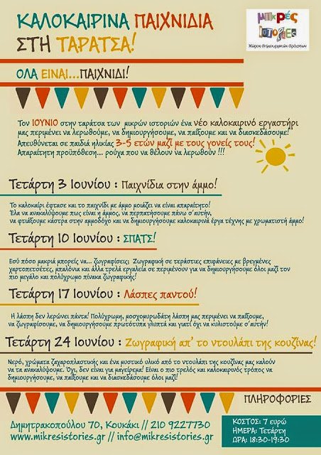 Τον Ιούνιο στην ταράτσα των Μικρών Ιστοριών, ένα χώρο 100τμ διαμορφωμένο με ειδική μελέτη για την ασφαλή χρήση της από τα παιδιά, ετοιμάζονται δύο νέα καλοκαιρινά εργαστήρια, κάθε Τετάρτη και Πέμπτη, 18:30-19:30. Δύο εργαστήρια στα οποία απαραίτητη προϋπόθεση για να συμμετάσχετε είναι να φοράτε ρούχα που θέλουν να λερωθούν! Απευθύνονται σε παιδιά ηλικίας 18-36 μηνών και 3-5 ετών, μαζί με τους γονείς τους, (ναι, ναι θα λερωθείτε παρεούλα). Ετοιμαστείτε λοιπόν φίλοι μου, ετοιμαστείτε να λερωθείτε, να δημιουργήσετε, να παίξετε και να διασκεδάσετε!