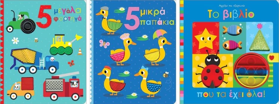Για μικρούτσικους ανθρώπους, από 18 μηνών, γιατί και αυτοί θέλουν τα βιβλία τους, ξεχωρίσαμε 3 νέες κυκλοφορίες από τις Εκδόσεις Παπαδόπουλος. Τα βιβλία 5 μεγάλα φορτηγά, 5 μικρά παπάκια και Το βιβλίο που τα έχει όλα είναι χαρτονένια, για να μην καταστρέφονται εύκολα, με μέρη από σιλικόνη, για να πιάνουν, να ζουλάνε, να εξασκούν τη λεπτή κινητικότητα, με κρυφά παραθυράκια και διαφορετικές υφές, τα οποία βοηθούν τα παιδιά να μάθουν να μετράνε, να αναγνωρίζουν χρώματα αριθμούς κ.α.