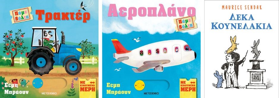 Για μικρά χεράκια αξίζει να αναζητήσετε και τα βιβλία Τρακτέρ και Αεροπλάνο από τη σειρά Πάμε βόλτα των Εκδόσεων Μεταίχμιο. Και αυτά είναι χαρτονένια, με κινούμενα μέρη που βοηθούν το παιδί να ασκεί τον συντονισμό ματιού-χεριού και τη λεπτή κινητικότητα. Η πλούσια εικονογράφηση προτρέπει το παιδί να ασκήσει την παρατηρητικότητά του, ενώ η ρίμα και ο ρυθμός το βοηθούν να συμμετάσχει στην ανάγνωση και να καλλιεργήσει τον προφορικό λόγο.