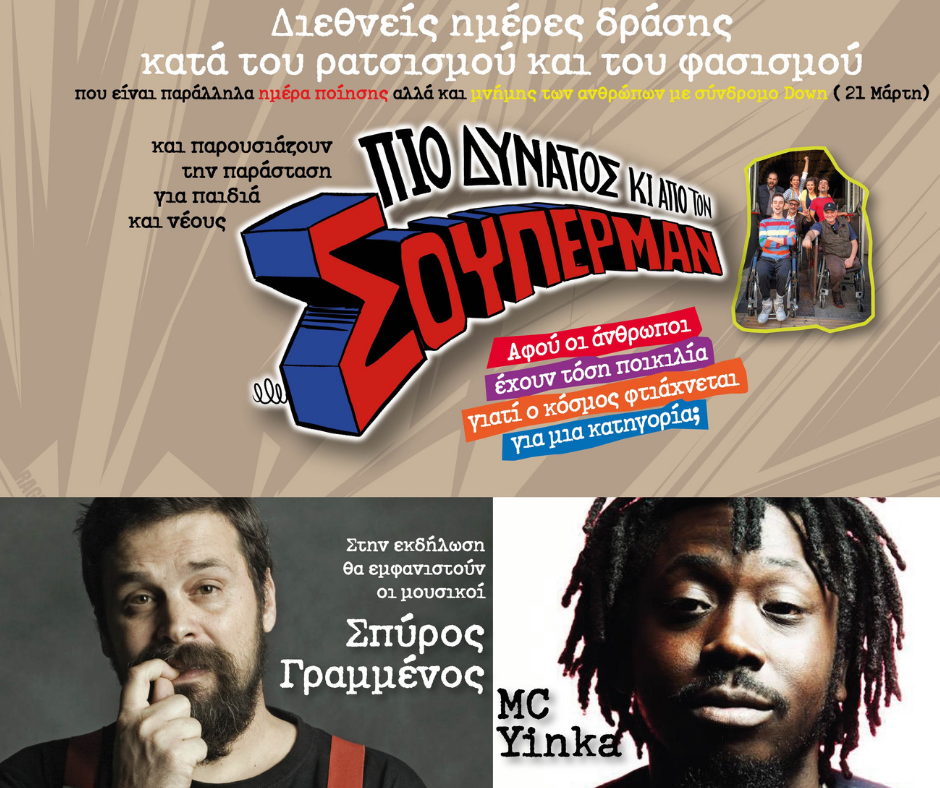 Η Συντεχνία του Γέλιου, σε συνεργασία με την Κίνηση Ανάπηρων Καλλιτεχνών, ανοίγει τις καλλιτεχνικές εκδηλώσεις για την Διεθνή ημέρα δράσης κατά του ρατσισμού και του φασισμού, που είναι παράλληλα ημέρα ποίησης αλλά και μνήμης των ανθρώπων με σύνδρομο Down (21 Μάρτη), τo Σάββατο 16 Μαρτίου στις 12.00. Στο ελεύθερο και αυτοδιαχειριζόμενο θέατρο ΕΜΠΡΟΣ (Ρήγα Παλαμήδου 2), θα παρουσιάσουν τη θεατρική παράσταση για παιδιά και νέους “Πιο δυνατός κι από τον Σούπερμαν”. Στην εκδήλωση θα εμφανιστούν οι μουσικοί Σπύρος Γραμμένος και MC Yinka.