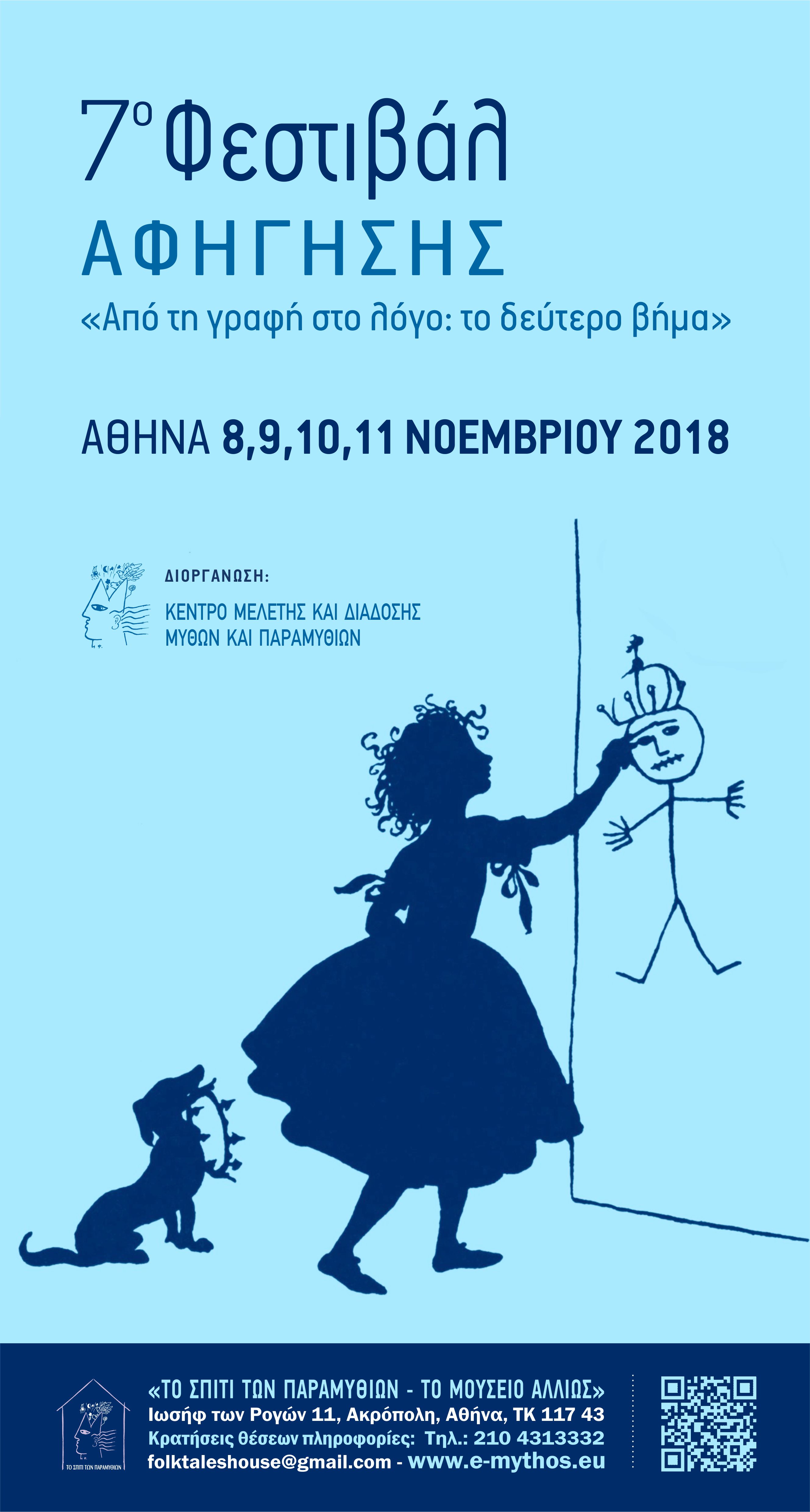 Το Κέντρο Μελέτης και Διάδοσης Μύθων και Παραμυθιών διοργανώνει για 7η χρονιά το Φεστιβάλ Αφήγησης στην Αθήνα, τη φετινή Παγκόσμια Πρωτεύουσα Βιβλίου. Το Φεστιβάλ θα πραγματοποιηθεί στο Σπίτι των Παραμυθιών-Το Μουσείο Αλλιώς, έναν χώρο για το παραμύθι και την αφήγηση, στις 8, 9, 10 και 11 Νοεμβρίου 2018 και έχει θέμα Από τη γραφή στο λόγο: το δεύτερο βήμα.