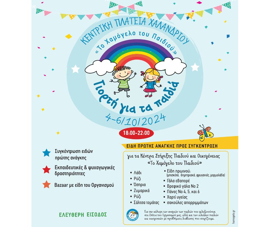 Και αυτή τη χρονιά, η Γιορτή για τα Παιδιά στο Χαλάνδρι είναι πολλά παραπάνω από μια απλή Γιορτή χαράς και παιχνιδιού. Είναι μια μεγάλη Γιορτή Αγάπης, καθώς όλοι μαζί συγκεντρώνουμε είδη πρώτης ανάγκης*, ενισχύοντας τις πανελλαδικές δράσεις του Κέντρου Υποστήριξης Ευάλωτων Οικογενειών, Παιδιών και Νέων, που καλύπτουν τις ανάγκες των παιδιών που φιλοξενούνται στα Σπίτια του Οργανισμού μας αλλά και των χιλιάδων παιδιών και οικογενειών με προβλήματα διαβίωσης που στηρίζει ο Οργανισμός.